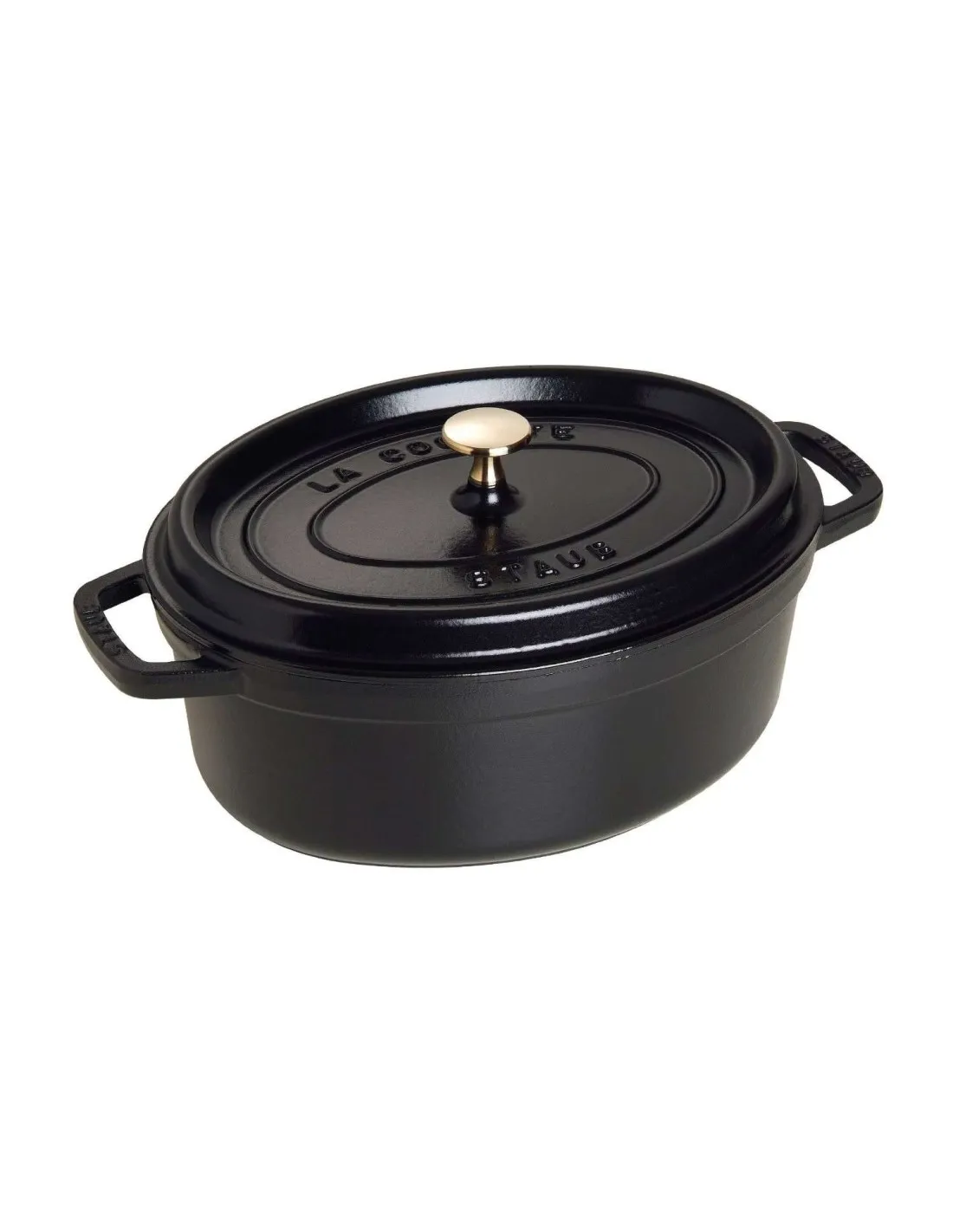 Cette cocotte ovale en fonte émaillée STAUB mat de 31 cm, est idéale pour 5 à 6 personnes, pour préparer des plats mijotés, des rôtis, de la volaille et même du pain ! Compatible tous feux et four, elle peut également s’utiliser sur induction. Véritable savoir-faire authentique de création française, cette cocotte est une pièce unique, issue d’un processus de fabrication traditionnel. Avec son design élaboré et son poids optimisé, son couvercle plat au contour marqué présente d’excellentes propriétés de rétention de l’humidité et assure grâce à ses picots®, un arrosage homogène, une pluie d’arômes, pour des plats qui mijotent longtemps. L’intérieur de cette cocotte est émaillé noir mat, la marque de fabrique STAUB. Cet émail de qualité supérieure permet d’obtenir une meilleure résistance aux rayures et facilite l’entretien. Il possède les propriétés idéales pour saisir, rôtir et caraméliser les aliments. Née en Alsace, la cocotte STAUB a su traverser le temps et les frontières. Préférée aussi bien par les amateurs que les grands chefs, elle passe aisément de la cuisine à la table. Quel que soit le plat que vous concoctez, avec la Cocotte STAUB vous avez l’assurance de conserver toute l’intensité et les saveurs, la viande restera tendre et les légumes moelleux. Composée de fonte, un alliage de fer riche en carbone, un des matériaux qui retiennent le mieux la chaleur, la diffuse lentement et la redistribue de manière parfaitement homogène. Une fois la fonte suffisamment chaude, ses propriétés de rétention de la chaleur permettent de réduire le feu au minimum, afin de laisser mijoter doucement les plats. La fonte conserve également le froid : la cocotte à température ambiante peut être placée au réfrigérateur avant de servir afin de rester froide une fois à table.