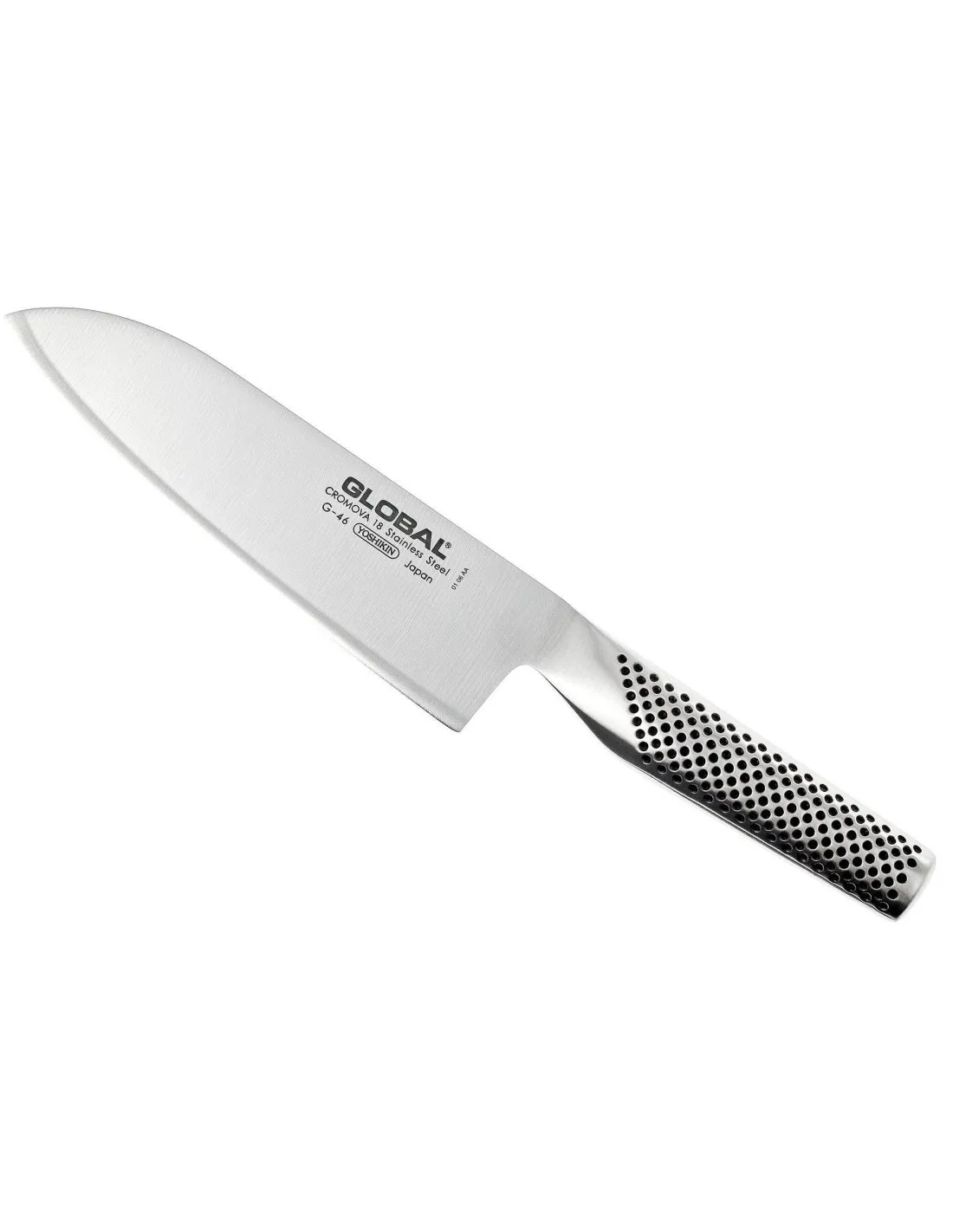 Couteau de cuisine Santoku G46, du Global japonais, avec une lame de 18 cm. Ce modèle est originaire du Japon et sa polyvalence est un point en votre faveur: coupez facilement de la viande, du poisson ou des légumes. L’une des principales caractéristiques des couteaux Global est leur conception, les couteaux sont forgés en une seule pièce composée du manche et de la lame. Pour la fabrication de la tôle, un acier inoxydable est utilisé, CHROMA 18, sa composition à haute teneur en chrome (contient 18% de chrome vanadium) lui confère une grande résistance à l’oxydation, tout en rendant la feuille très résistante à l’usure.- Lame: acier inoxydable Chrome 18.- Dureté: environ 56 - 58 HRC.- Câble: acier inoxydable, Le motif des points noirs sur le manche est la caractéristique de cette marque de couteaux japonais.- Type de lame: tranchant des deux côtés, droitier et gaucher
