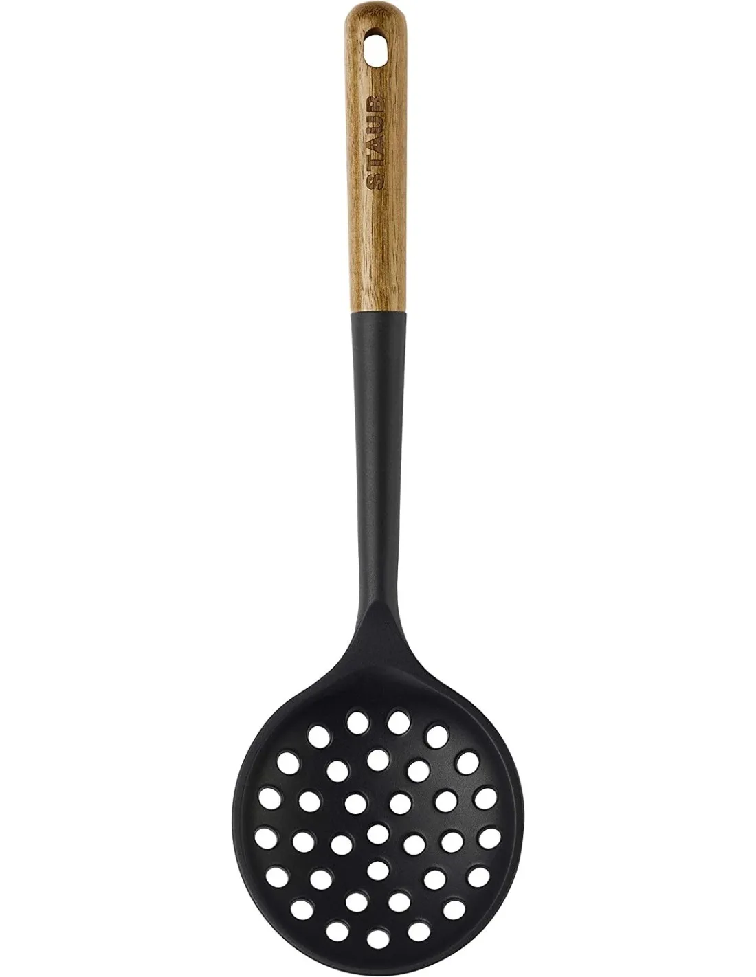 Avec la nouvelle série d'ustensiles, STAUB complète sa gamme d'ustensiles de cuisine. Le design est ergonomique, fonctionnel et en même temps beau, ce qui fait que les ustensiles s'accordent harmonieusement avec les autres produits STAUB dans la cuisine et sur la table. La louche à écumer est l'outil idéal pour retirer les boulettes ou les légumes d'une casserole, pour sortir les œufs durs de l'eau ou les frites de la friteuse. Les trous permettent au liquide de retomber dans la casserole. Il est également idéal pour retirer la graisse d'un bouillon ou d'une soupe, ce qui est encore plus efficace lorsque le bouillon a refroidi et que la graisse s'est figée. C'est un moyen facile de rendre votre bouillon maison plus sain et plus délicieux. Le manche est en bois d'acacia et suffisamment long pour protéger du liquide chaud, tandis que la partie principale de la louche à écumer est en silicone noir mat. Ce matériau de haute qualité convient à toutes les surfaces, y compris les surfaces antiadhésives. Il est extrêmement durable et résiste à la chaleur jusqu'à 220 °C.
