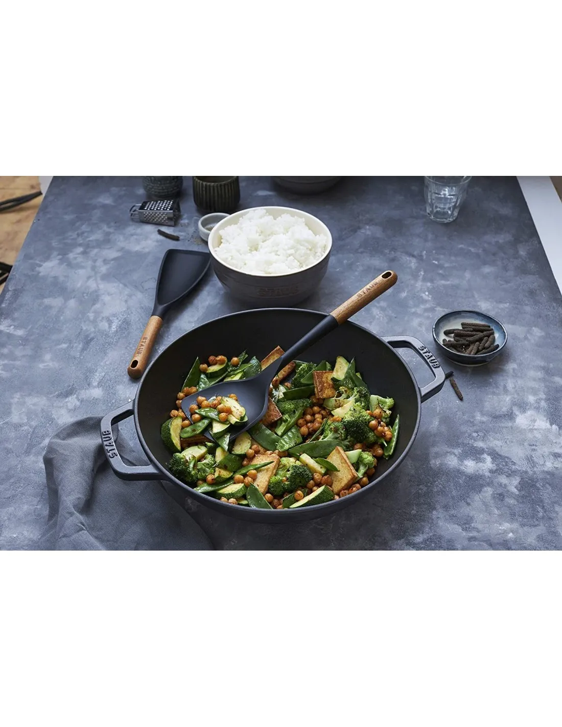 Idéal pour une utilisation avec des woks, vous pouvez utiliser cette spatule pour cuire, retourner, remuer et retourner vos sautés tout en atteignant chaque coin de votre batterie de cuisine. Les outils en silicone STAUB sont le cadeau parfait pour les jeunes mariés, les nouveaux propriétaires ou les fans de STAUB de longue date. Beaux et ergonomiques, les outils STAUB sont soigneusement profilés pour tenir confortablement dans la main afin que vous puissiez mélanger sans effort les ragoûts, écrémer les soupes et retourner les steaks. Chaque outil est fabriqué à partir de silicone noir mat ultra durable, sans BPA, résistant aux températures élevées et sûr à utiliser sur toutes les surfaces de cuisson, y compris antiadhésif. Le silicone élégant est complété par de beaux manches en bois d'acacia, chacun présentant un motif unique de grain de bois. Et leurs boucles de suspension pratiques assurent un rangement facile.