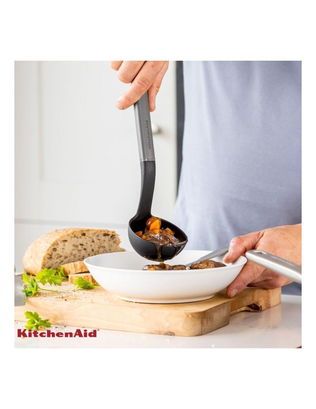 Louche du quotidien avec tête en nylon renforcé qui n’abîme pas les ustensiles et facilite le service. Résiste jusqu’à 232 °C / 450 °F, compatible antiadhésif, avec manche ergonomique gris charbon et œillet de suspension. Idéale pour soups, bouillons, sauces et ragoûts.