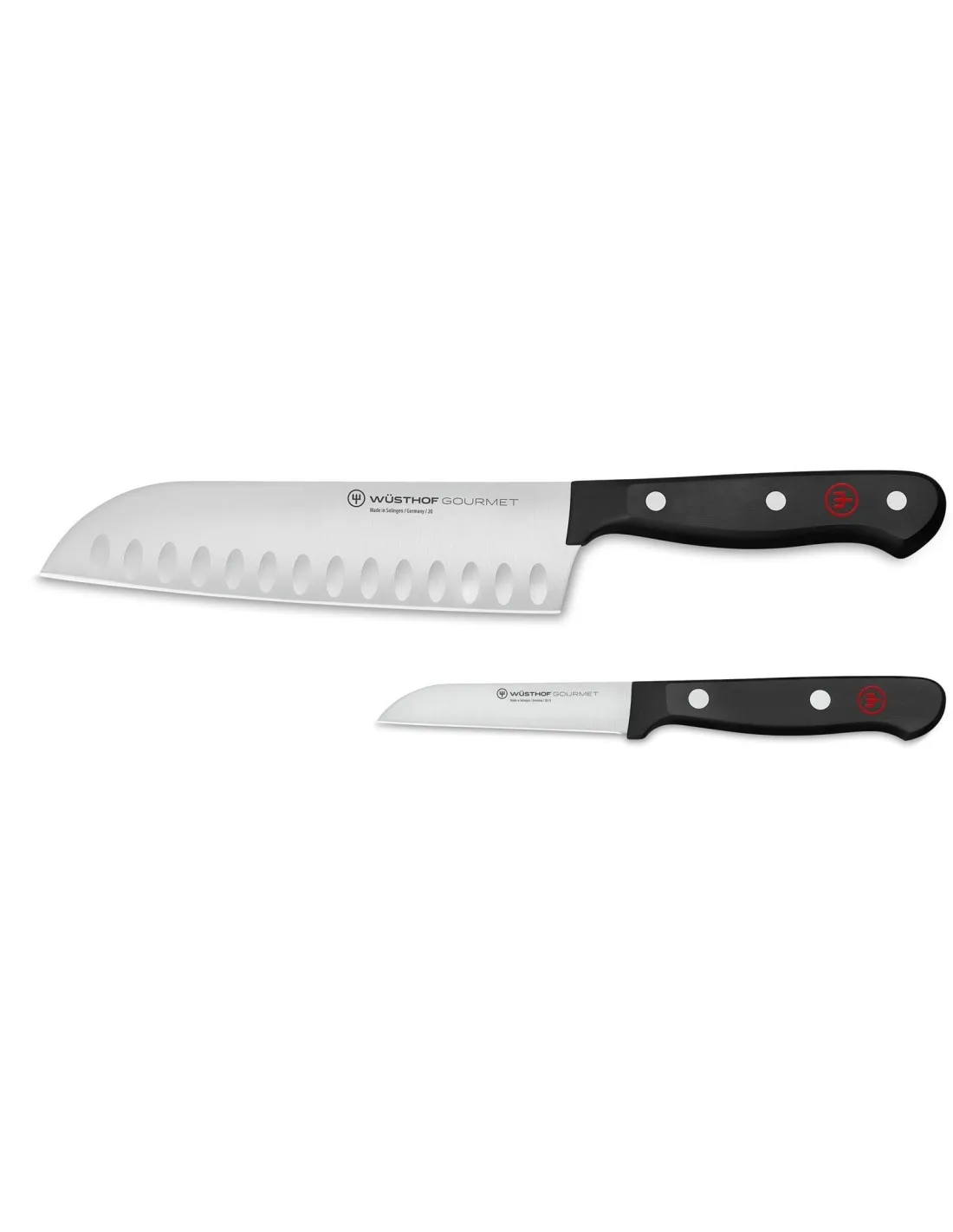 Ensemble de couteaux Wusthof série gastronomique du chef asiatique. Composé d’un santoku de 17cm un couteau à légumes 8cm.
