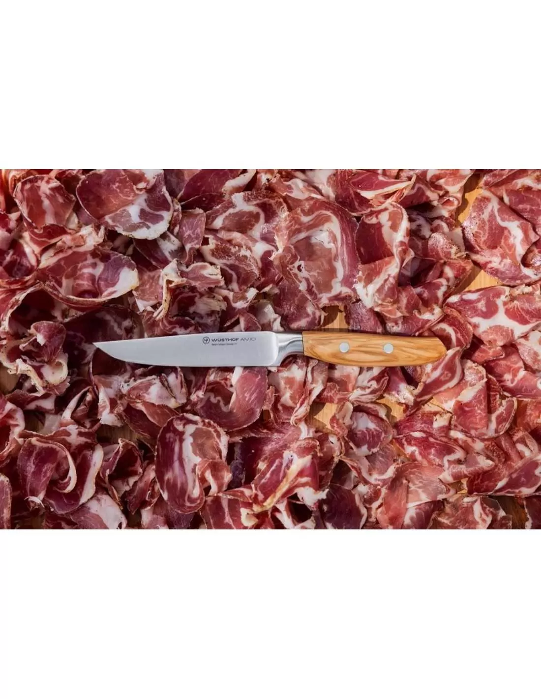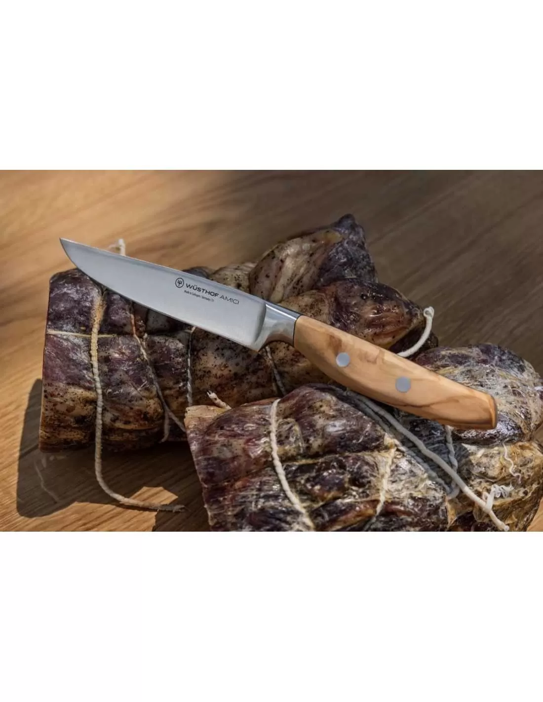 La lame extra-aiguisée de WÜSTHOF à bord lisse : ce couteau ne rend pas seulement justice à un bon steak de bœuf, mais il coupe également tous les autres types de viande sans en déchirer les fibres. Il devrait donc toujours être sur la table lorsque la viande est au menu. Inspiré par des souvenirs de famille et d'amis se réunissant al fresco à la campagne, WÜSTHOF Amici célèbre une vie plus simple. C'est une vie liée à la nature, à l'amour de la bonne nourriture et à l'affection pour tous ceux que nous invitons à table. La lame forgée sculptée est associée à un manche en bois d'olivier aux nuances uniques - il n'y en a pas deux pareils. Amici associe un gracieux style de vie méditerranéen à un savoir-faire artisanal ancien, créant ainsi un rappel spirituel de la nécessité de chérir les moments précieux de la vie.