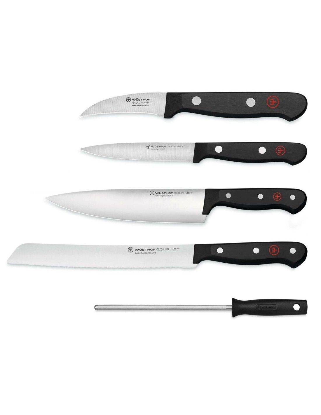 Wüsthof décrit la gamme Gourmet comme une série où chaque geste devient une expérience sensorielle, avec des lames fabriquées en acier Wüsthof et conçues pour durer. Cet ensemble offre une base solide pour couper, trancher, parer, affûter et organiser les ustensiles essentiels de cuisine.