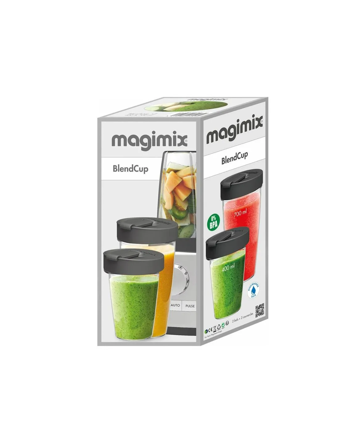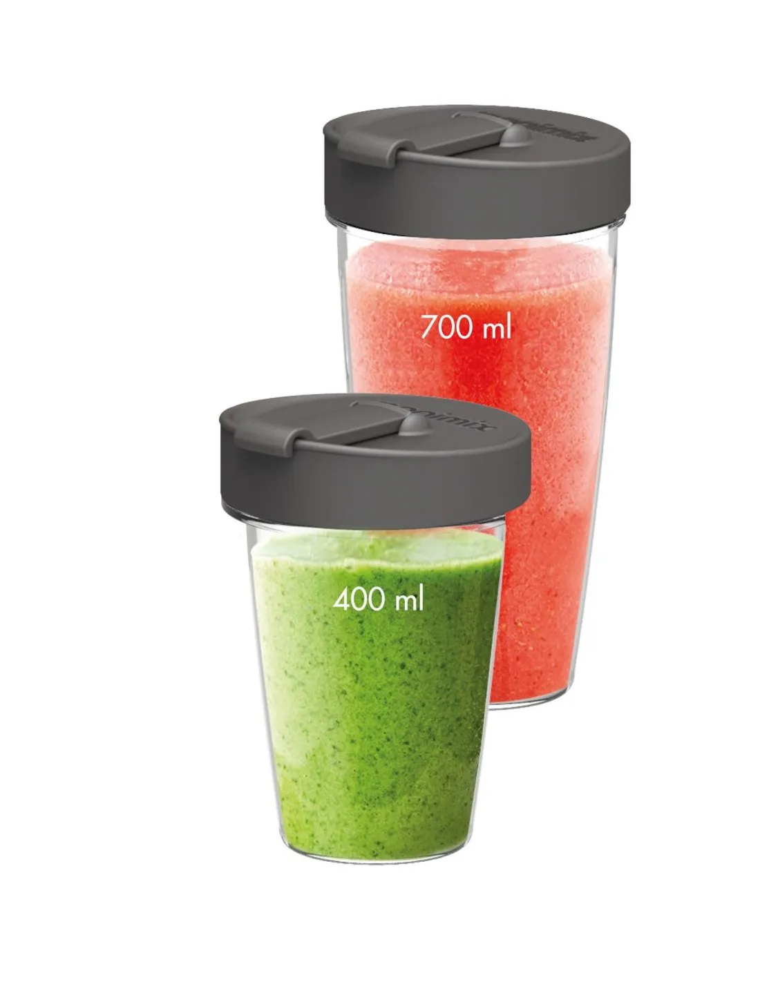 2 Copos transportáveis e fáceis de usar (2 x 400 ml) para preparar, transportar ou armazenar facilmente todas as suas preparações. Projetado exclusivamente para o Juice Expert da Magimix. Também são compatíveis com os Blenders Magimix.