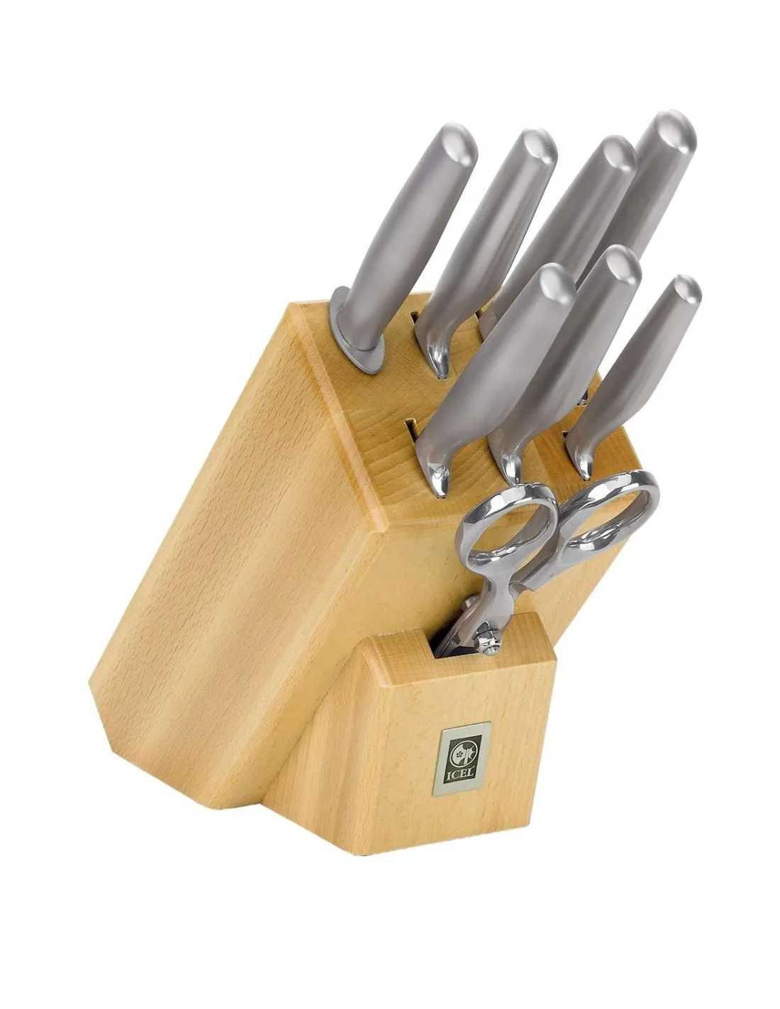 O Bloco de facas com 8 peças - Platina é produzido com lâminas forjadas de aço inox de qualidade superior com crómio-molibdénio-vanádio (X50CrMoV15). As lâminas forjadas são produzidas utilizando o método de aquecimento do aço seguido de moldagem da peça. Caracterizam-se por apresentar um bolster robusto, são mais pesadas, atingem maior dureza e requerem menos afiação. Simplicidade e design ergonómico. Cabos produzidos com aço inox AISI 304, não mancha e não escorrega mesmo com as mãos molhadas.