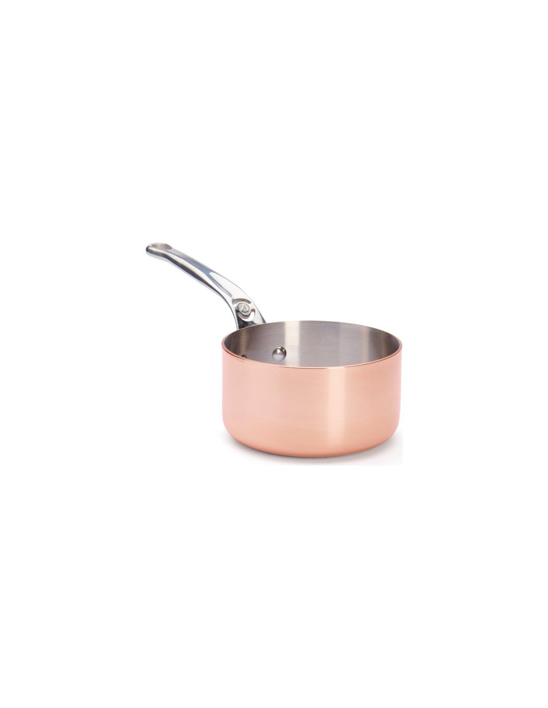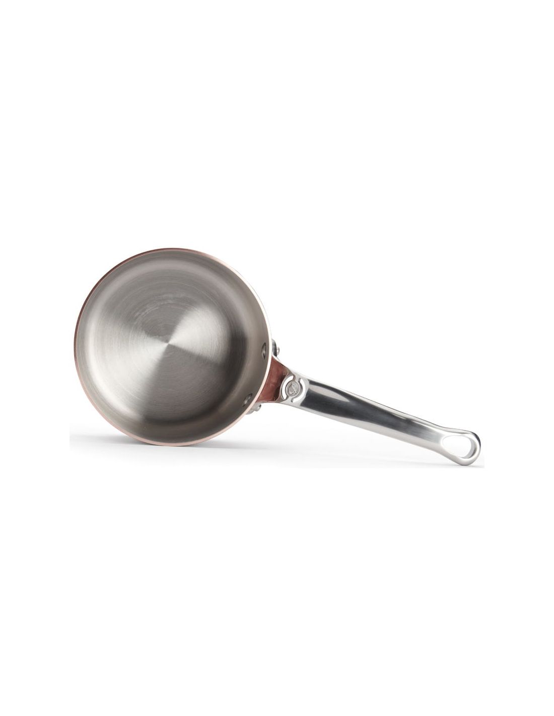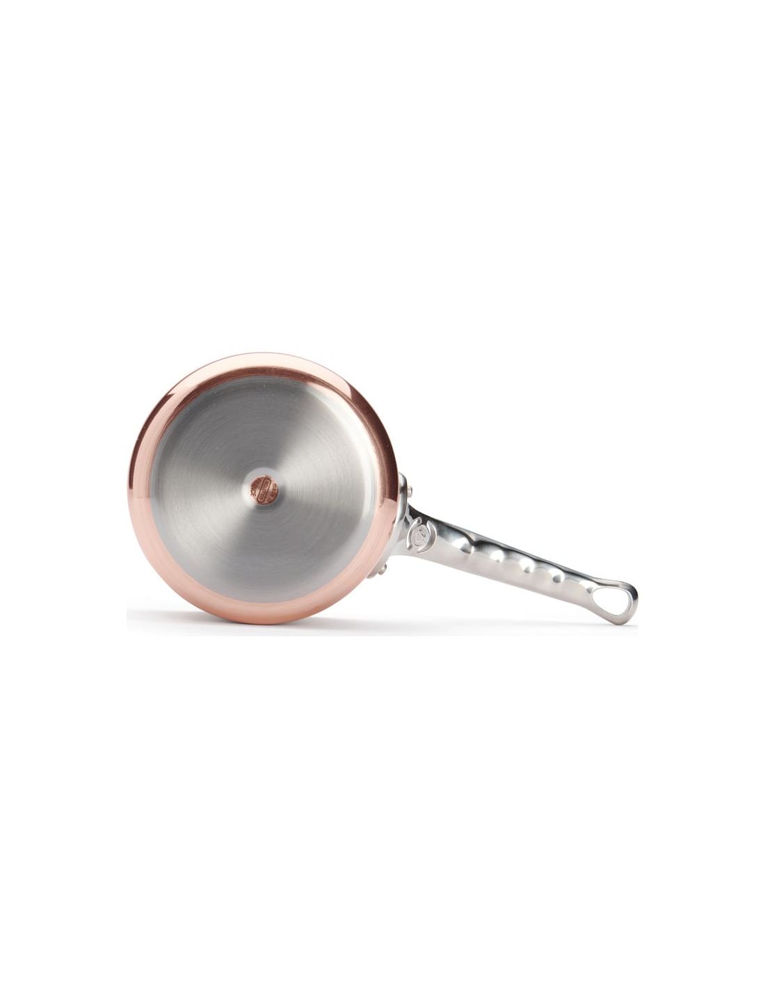 O cobre permite uma transmissão de calor muito rápida e homogénea em todo o corpo da peça, ajudando a obter resultados mais consistentes e um controlo mais fino da confeção. O interior em aço inoxidável facilita a utilização e a manutenção, sem necessidade de estanhagem. O cabo em aço inox fundido rebitado proporciona um manuseamento firme e elegante, em linha com a estética sofisticada da coleção PRIMA MATERA.