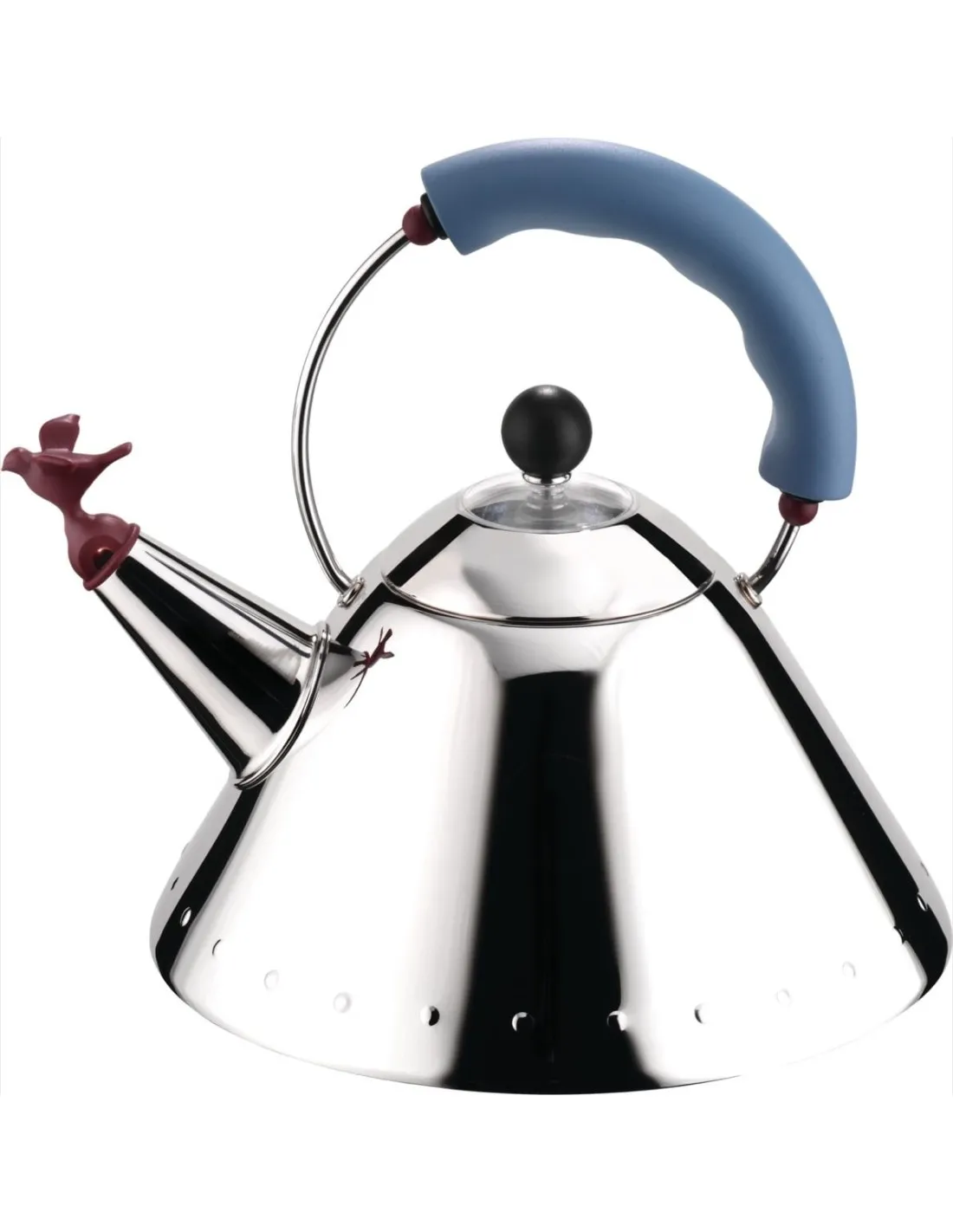 A icónica chaleira da Alessi, desenhada por Michael Graves em 1985, aclamada principalmente por imitar o cantar de um pássaro. Uma forma cónica em aço inoxidável polido com elementos em plástico colorido e a cereja no topo do bolo, um pássaro vermelho escuro que assobia quando a água está a ferver. Adequado para cozinhar por indução. Esta chaleira é protegida por patente como modelo ornamental. É feita em aço inoxidável 18/10, com fundo radiante em aço AISI 430. O forro da pega e o assobio são feitos em poliamida. Apto para indução.