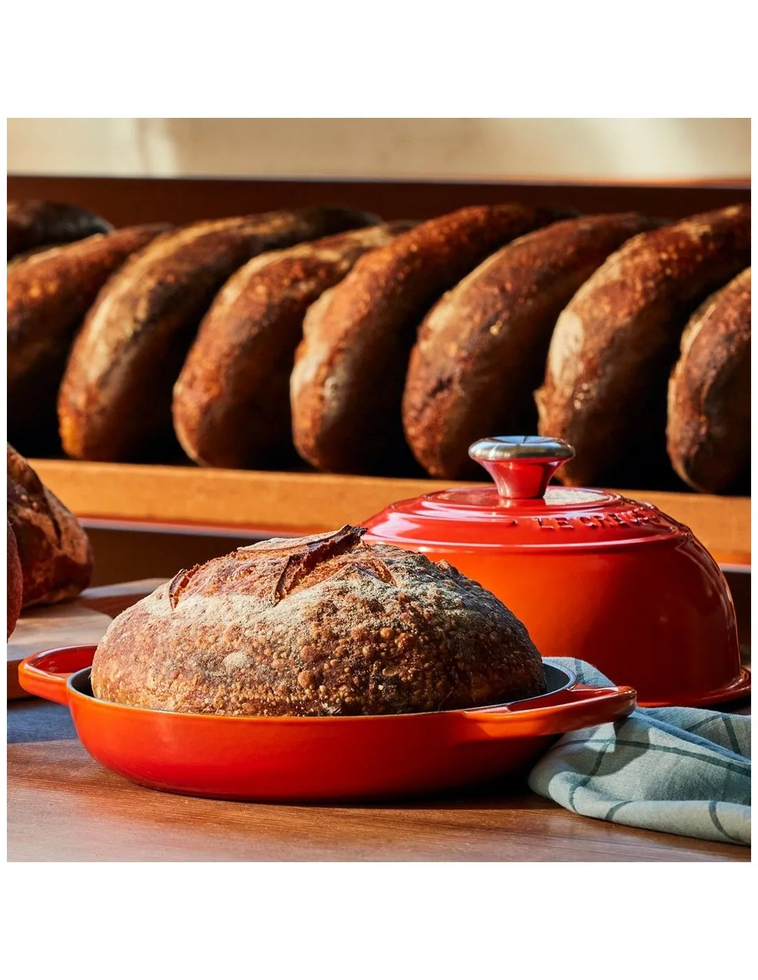 Fazer o pão perfeito em casa nunca foi tão fácil. Fabricada no nosso famoso ferro fundido, para uma distribuição melhorada do calor, a cocotte para pão foi concebido para oferecer resultados dignos de uma padaria. A tampa em forma de cúpula retém o vapor e permite que este circule, para um pão volumoso e com todo o sabor, enquanto a base de perfil baixo promove que o exterior fique dourado e crocante de forma uniforme, marcado com os nossos icónicos três anéis. Com um esmalte interior preto mate e pegas ergonómicas, a cocotte para pão da Le Creuset faz com que fazer pão de qualidade profissional seja fácil. -Fácil como num sonho: graças às nossas pegas grandes, é fácil de mover do fogão para o forno e para a mesa, mesmo usando luvas.-Comida com excelente sabor: a construção em ferro fundido retém o calor, para cozinhar e dourar de forma uniforme. As suas criações deliciosas também se manterão quentes na mesa durante mais tempo.-Fácil de agarrar: as suas pegas elegantes e confortáveis tornam-no fácil de levantar.-Sem demasiado calor: cozinhe numa temperatura baixa a média, para obter resultados deliciosos e cuidar do ferro fundido.