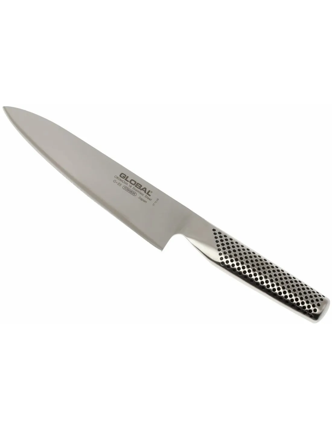 Faca Global G-55 chef muito versátil para cortar em rodelas, filetagem e para a preparação de peixe e carne. Forjada numa única peça, é especialmente leve e com um equilíbrio perfeito na mão. Uma das principais características das facas Global é o seu design, as facas são forjadas numa única peça composta pelo cabo e lâmina. Para o fabrico da folha, utiliza-se um aço inoxidável, o CHROMA 18, a sua composição de elevado teor de crómio (contém um 18% de cromo vanadio) confere-lhe uma grande resistência à oxidação, ao mesmo tempo que torna a folha muito resistente ao desgaste. O padrão dos pontos pretos no cabo é a característica desta marca de facas japonesas.