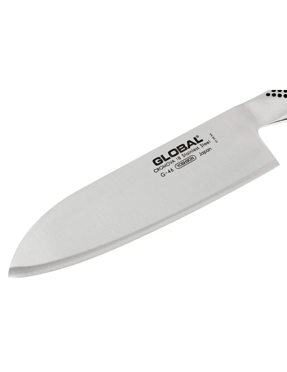 Faca de cozinha Santoku G46, da marca japonesa Global, com uma lâmina de 18 cm. Este modelo é originário do Japão e sua versatilidade é um ponto a seu favor: corta carne, peixe ou legumes com facilidade. Uma das principais características das facas Global é o seu design, as facas são forjadas numa única peça composta pelo cabo e lâmina. Para o fabrico da folha, utiliza-se um aço inoxidável, o CHROMA 18, a sua composição de elevado teor de crómio (contém um 18% de cromo vanadio) confere-lhe uma grande resistência à oxidação, ao mesmo tempo que torna a folha muito resistente ao desgaste.- Lâmina: aço inoxidável Cromova 18.- Dureza: aproximada 56 - 58 HRC.- Cabo: aço inoxidável, O padrão dos pontos pretos no cabo é a característica desta marca de facas japonesas.- Tipo de lâmina: afiada em ambos os lados, destro e canhoto