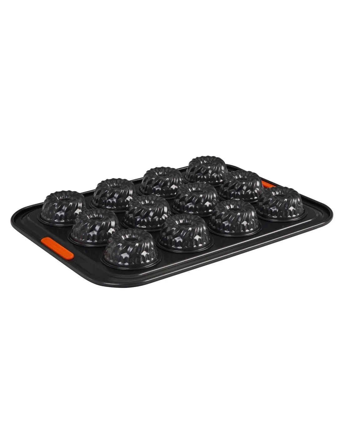Forma 12 mini bundts da Le Creuset. A borda larga no exterior da forma, com inserções de silicone resistentes ao calor, permite um agarrar melhor especialmente ao tirá-la de um forno quente. Revestimento antiaderente sem PFOA no interior e no exterior do produto. O alimento desliza com facilidade e não se pega. Apto para fornos até 240 °C.