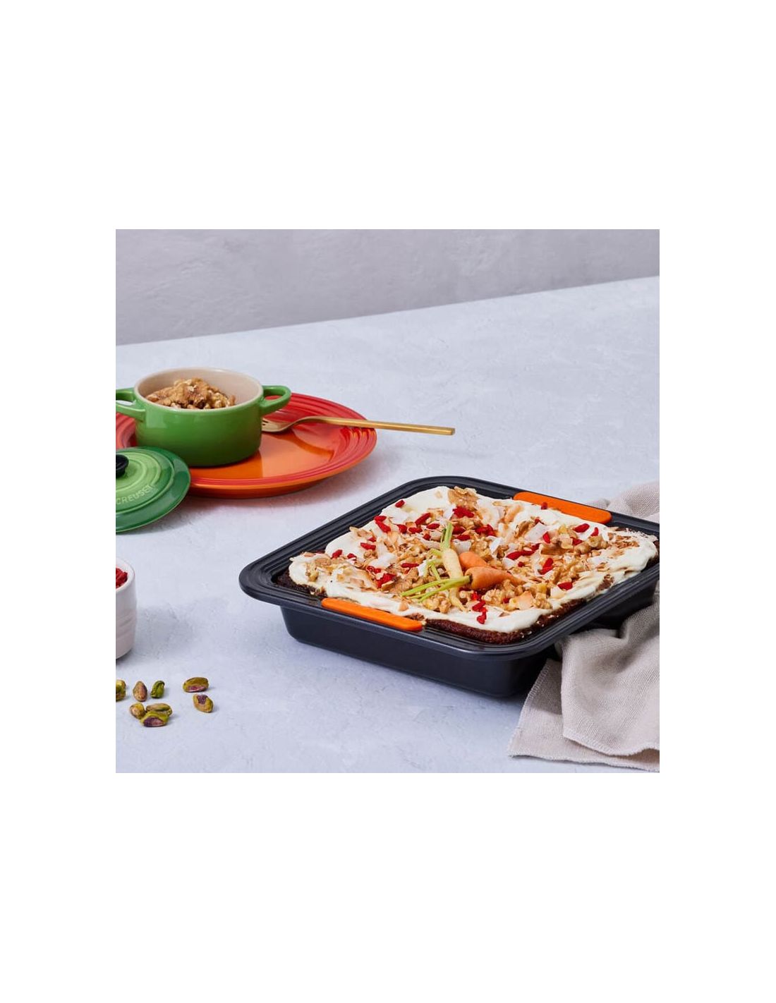 A Forma quadrada Le Creuset é ideal para várias receitas. Perfeita para fazer massas, tartes, pão, brownies e outras delícias. Também é ideal para utilizar como um pequeno recipiente de ir ao forno. A borda larga no exterior da forma, com inserções de silicone resistentes ao calor, permite um agarrar melhor, fácil e seguro, especialmente ao tirá-la de um forno quente. A Le Creuset desenvolveu uma gama Premium para satisfazer os apaixonados pela pastelaria. Aço carbono de grande espessura, que distribui o calor de forma uniforme e eficiente. Propagação do calor uniforme e excelente retenção do calor. Revestimento antiaderente sem PFOA no interior e no exterior do produto. O alimento desliza com facilidade e não se pega. Duradouro, com construção forte e rígida para que o produto não se deforme durante a utilização e com o passar do tempo. Apto para fornos até 240 °C. Garantia vitalícia.
