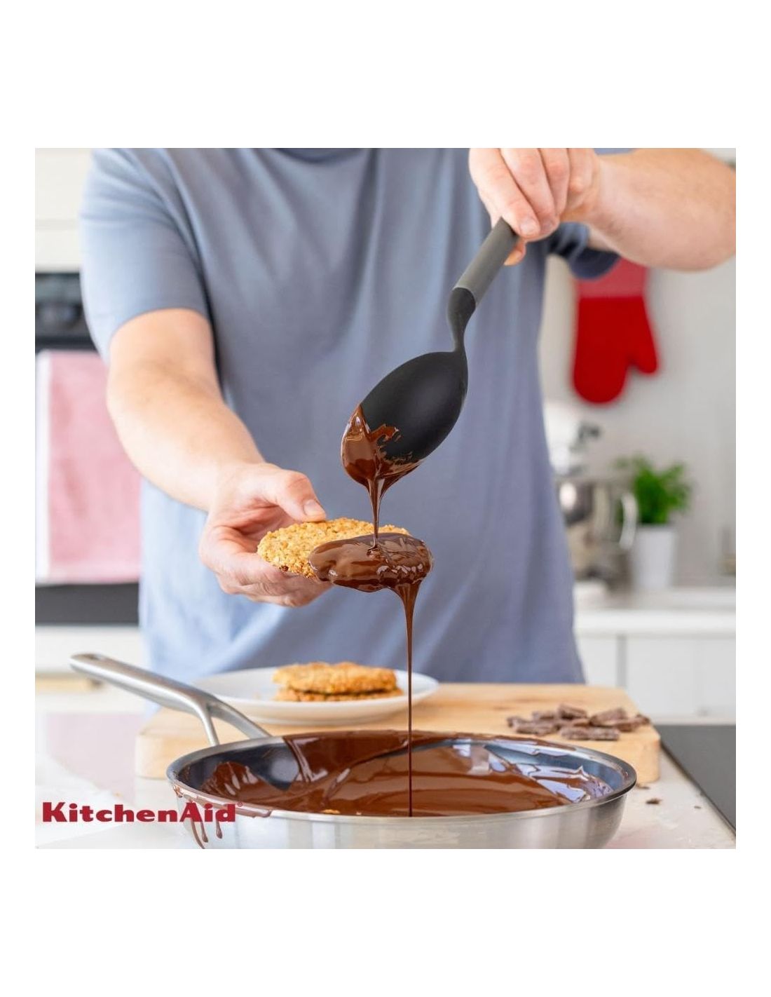 Colher perfurada de uso diário com cabeça em nylon reforçado que drena líquidos com facilidade sem riscar as panelas. O cabo ergonómico em cinza carvão oferece pega segura, com olhal para pendurar. Resistente ao calor até 232 °C e apta para máquina de lavar loiça — perfeita para servir legumes, massas e fritos diretamente da panela.