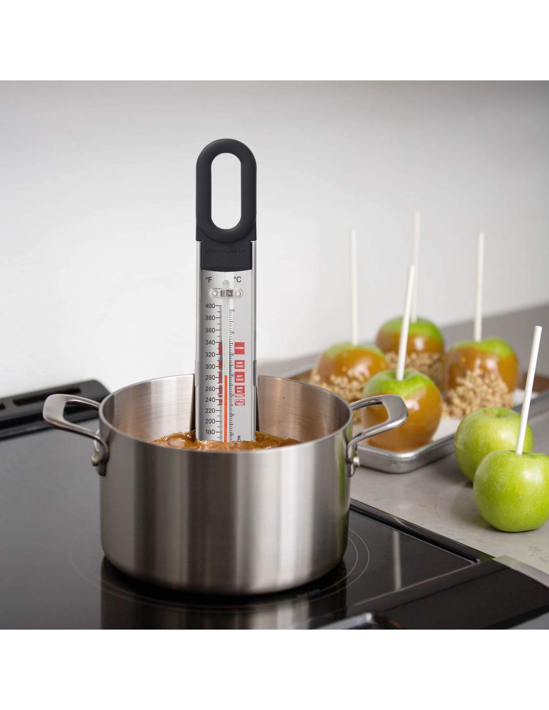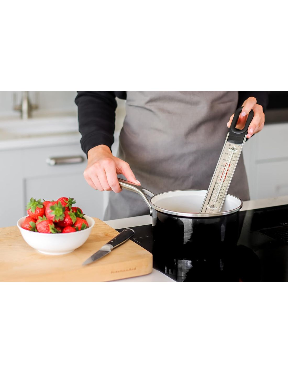 Colher de cozinha de uso diário com cabeça em nylon que mexe e serve com suavidade sem riscar os utensílios. Resistente ao calor até 232 °C / 450 °F, com cabo ergonómico em cinza carvão e olhal para pendurar. Apta para máquina de lavar loiça — perfeita para sopas, molhos e massas.