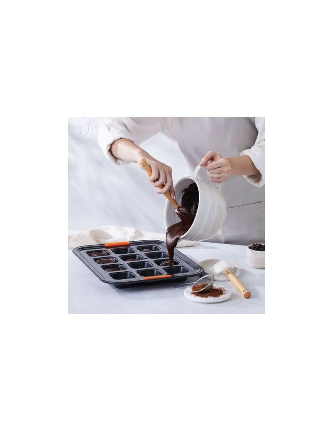 Forma 12 mini bundts da Le Creuset. A borda larga no exterior da forma, com inserções de silicone resistentes ao calor, permite um agarrar melhor especialmente ao tirá-la de um forno quente. Revestimento antiaderente sem PFOA no interior e no exterior do produto. O alimento desliza com facilidade e não se pega. Apto para fornos até 240 °C.