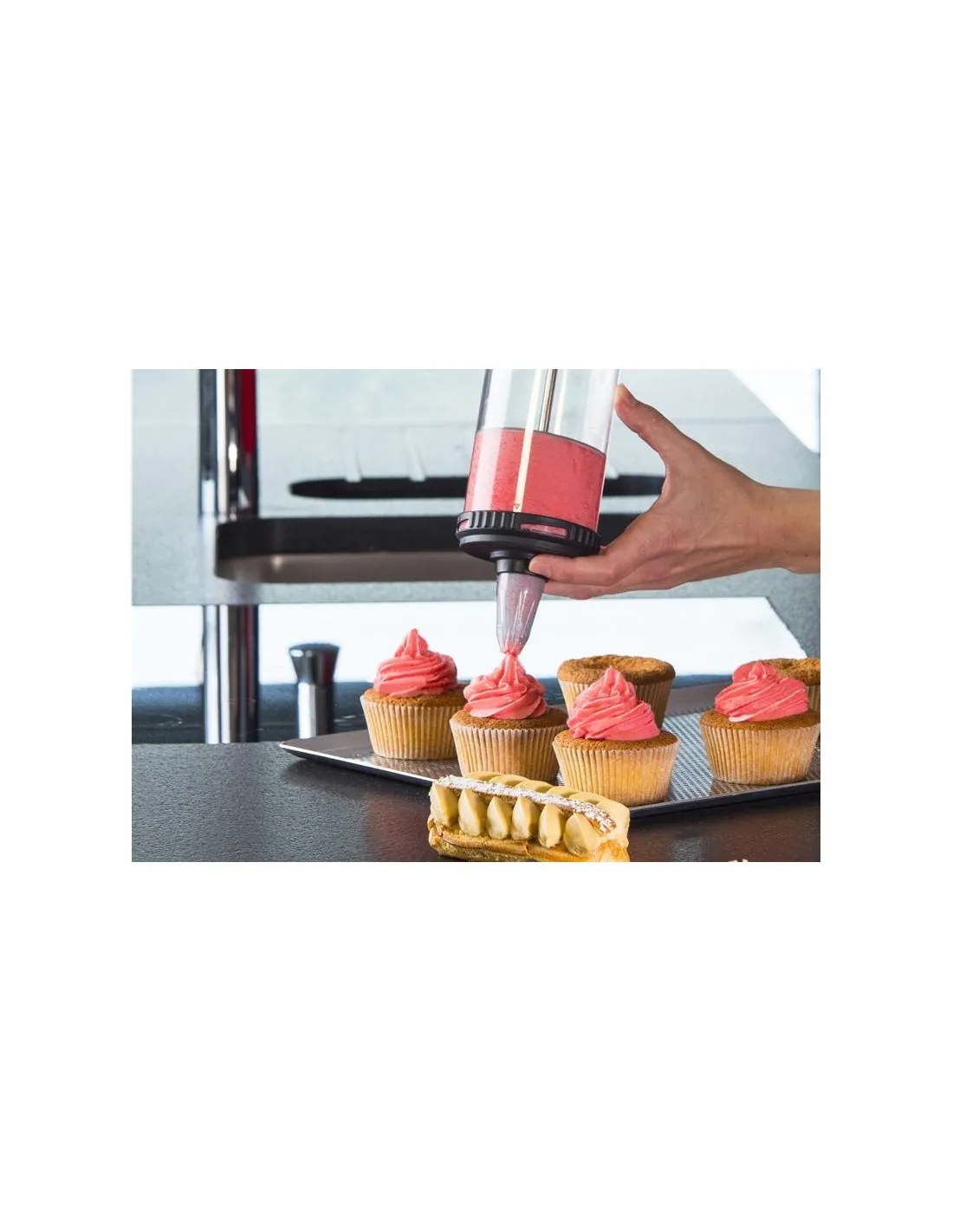 Le Tube, uma seringa com válvula de pressão para pastelaria com as mesmas aplicações que os sacos de pasteleiro: enchimento, guarnição ou decoração. Ideal com preparações espessas como cremes, mousses espessas, massa ... simples de utilizar: distribui a quantidade certa da preparação exercendo pressão sobre a pega. Tem um botão com graduações (cl e oz) para regular com precisão a quantidade dispensada. O recipiente transparente de 0,75L também é graduado (cl e oz) e fácil de preencher. Pode ir ao frigorífico, congelador e blast-chiller. Apenas o recipiente transparente é apto para microondas.