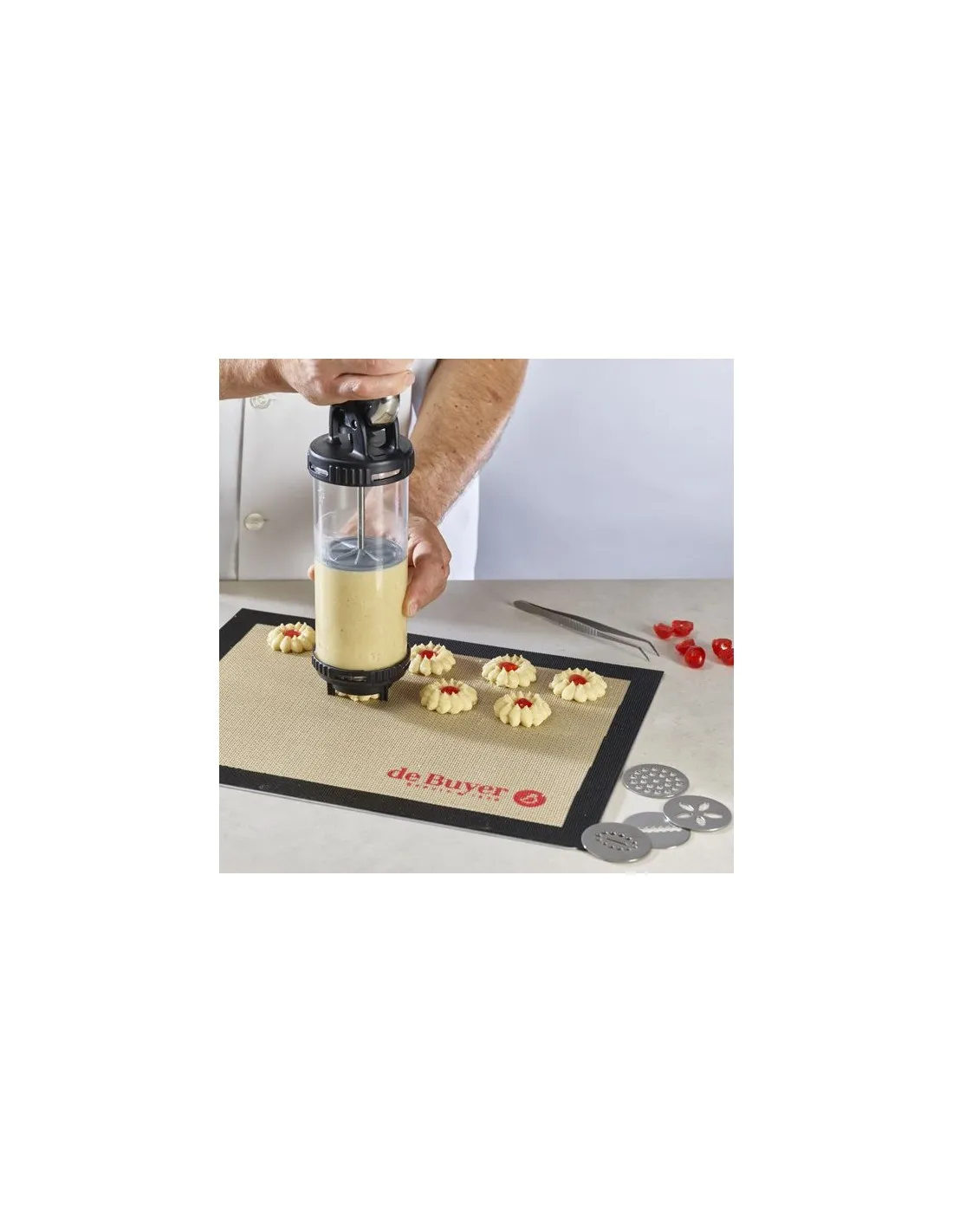 Kit especial de biscoitos, composto por 2 tampas lisas, uma tampa especial (suporte de disco) e 13 discos de decoração removíveis para fazer vários biscoitos originais