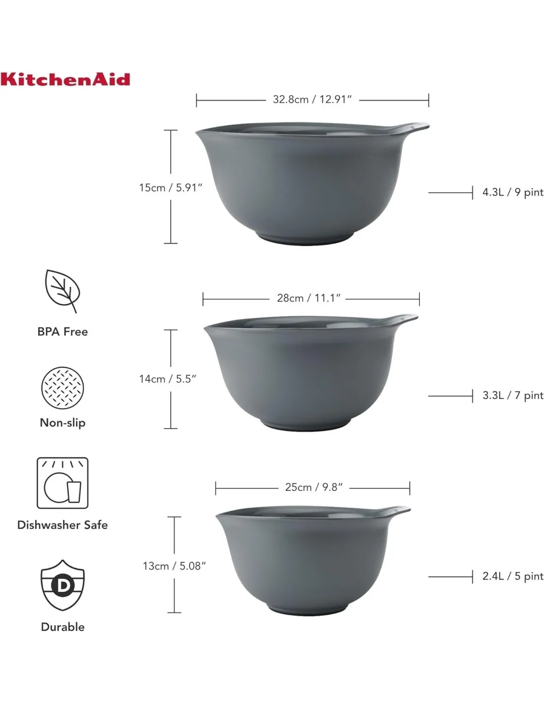 Este conjunto de taças de mistura KitchenAid 3pc inclui uma taça de 2,4 litros, uma taça de 3,3 litros e uma taça de 4,3 litros. Todas possuem bases antiderrapantes que aumentam a estabilidade durante a mistura, além de bicos de despejo para reduzir os derrames durante a transferência de ingredientes. As taças encaixam-se umas nas outras quando não estão a ser utilizadas para facilitar a arrumação e podem ser lavadas na máquina de lavar louça para uma limpeza fácil. Também podem ser colocadas no micro-ondas até cinco minutos.