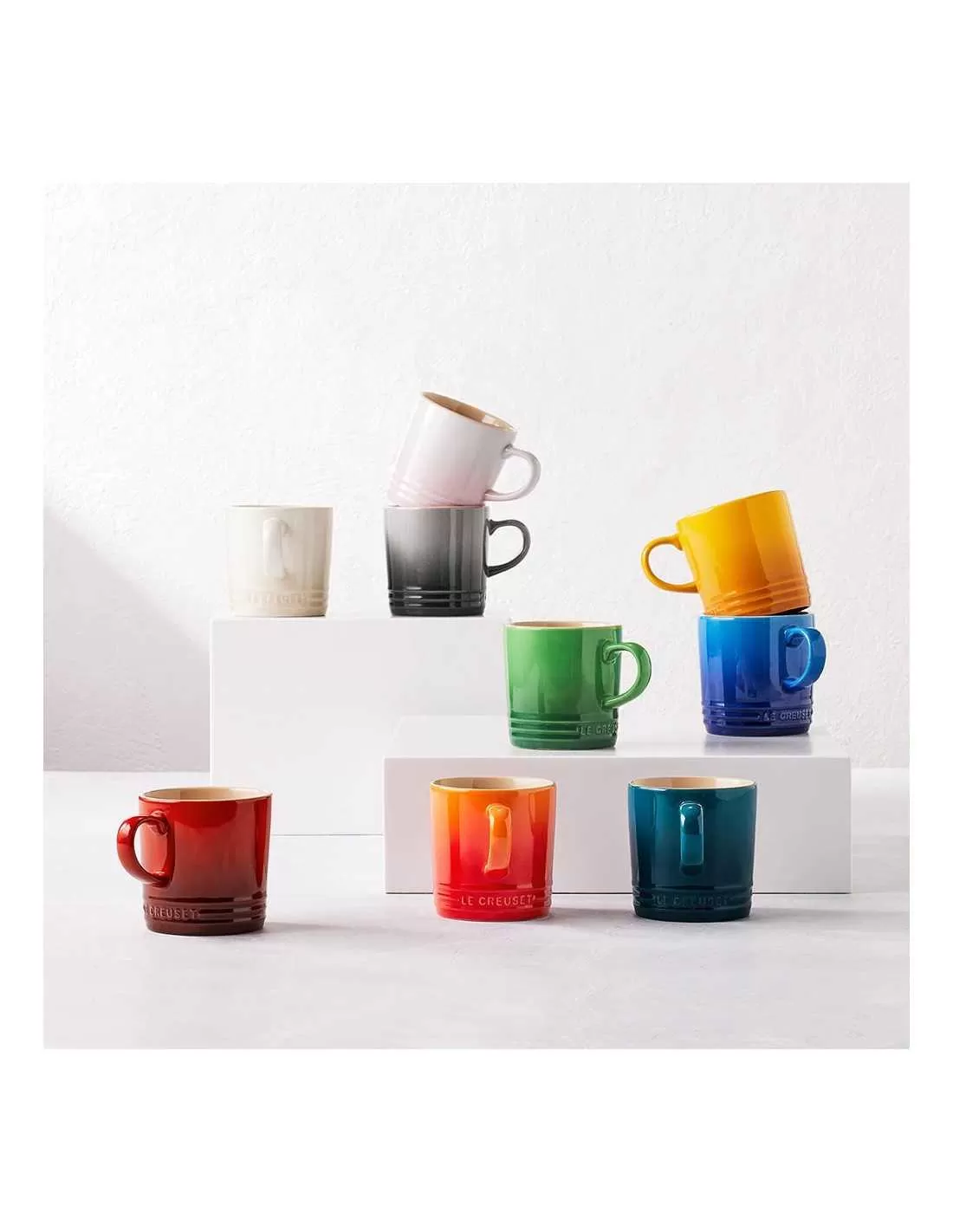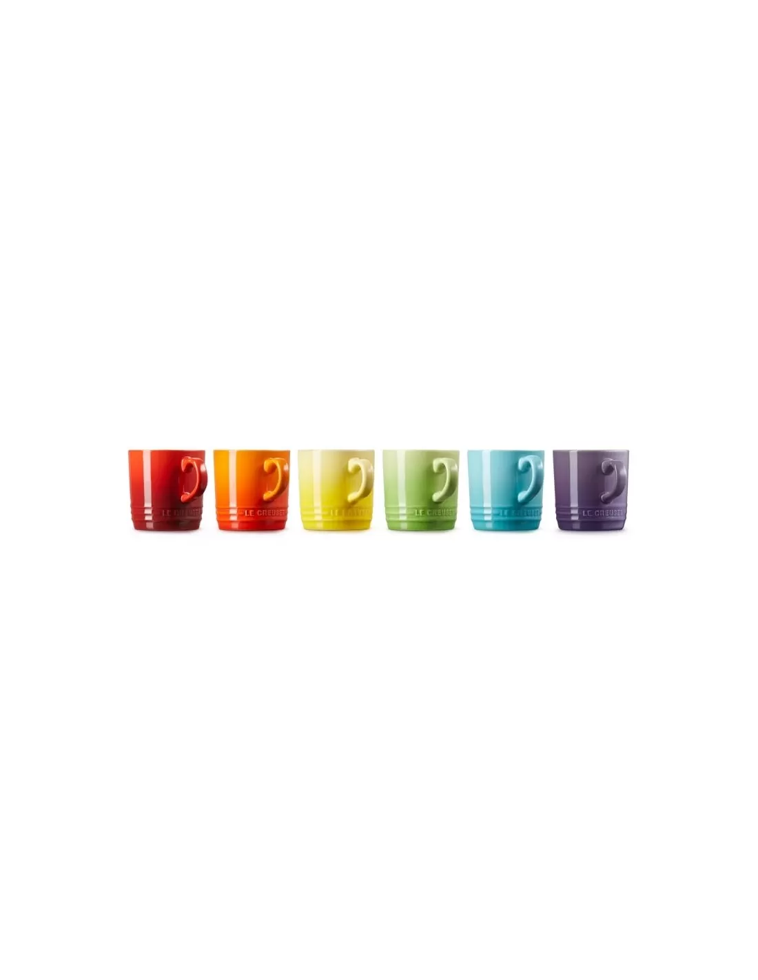 Parte da colorida Coleção Rainbow da Le Creuset, estas chávenas em cerâmica de grés de 200 ml constituem a forma perfeita de servir um espumoso cappuccino com estilo. São também a forma ideal de servir outras bebidas quentes e combinam perfeitamente com o seu uso no dia-a-dia. O conjunto é fabricado com grés de primeira qualidade, apresentando as cores Cerise, Volcanic, Soleil, Palm, Teal, Caribe e Ultra Violet numa embalagem de oferta.