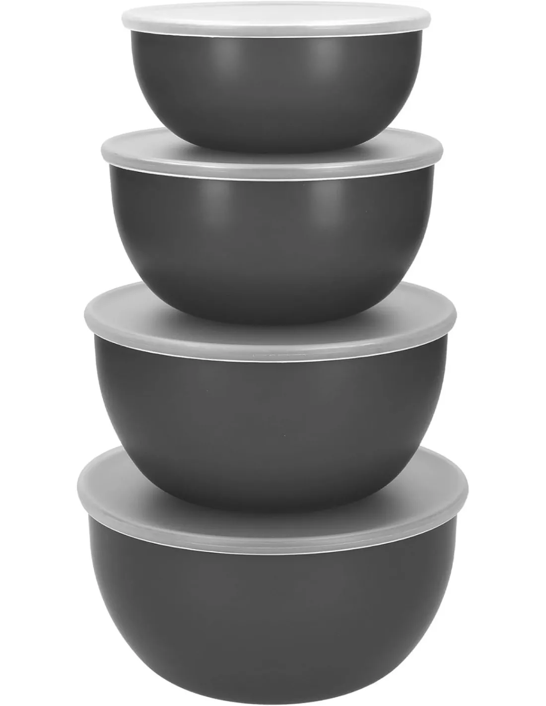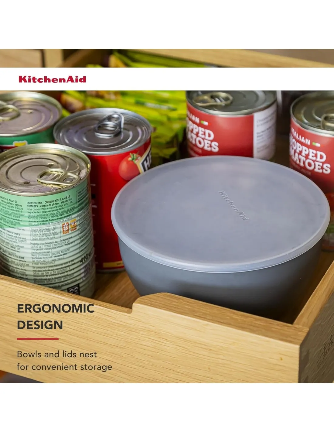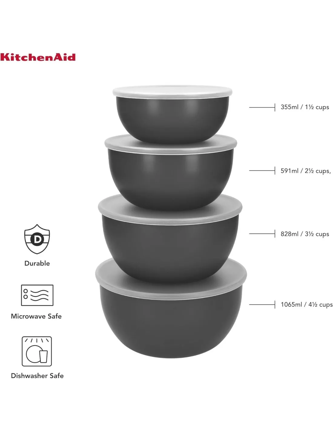 Este conjunto de taças de preparação de refeições KitchenAid é ideal para preparar e armazenar vegetais, ervas e outros ingredientes antes de começar a cozinhar. Este conjunto de quatro taças de preparação inclui 1½, 2½, 3½ e 4½ chávenas (equivalentes aos tamanhos 355ml, 591ml, 828ml e 1065ml). As taças vêm com tampas para que possa preparar e guardar os ingredientes com antecedência, e encaixam-se umas nas outras para poupar espaço entre utilizações. Podem ser lavadas na máquina de lavar loiça para uma limpeza fácil e podem ir ao micro-ondas até cinco minutos.