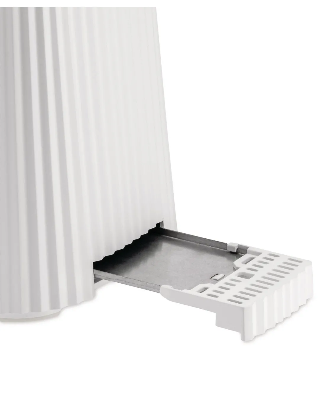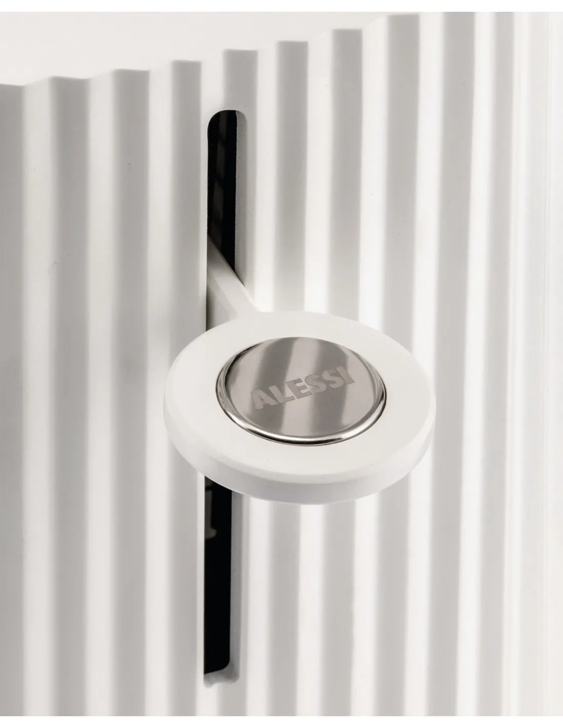 A torradeira branca Plissé da Alessi possui um design dinâmico e escultural inspirado no mundo da moda e da arquitetura. Desenhado por Michele De Lucchi, a torradeira tem uma textura de superfície única que se assemelha a um tecido plissado - é simplesmente bonita demais para ser mantida escondida no armário da cozinha! Pode escolher o nível de torragem entre seis opções diferentes. Também possui uma função de descongelamento e de reaquecimento que aquece o pão à temperatura desejada em 30 segundos. 6 níveis de torra diferentes Funções de aquecimento, descongelação e bagel Bandeja de migalhas removível Cabo integrado que pode ser enrolado sob a base após o uso Base antiderrapante Fácil de limpar Livre de BPA