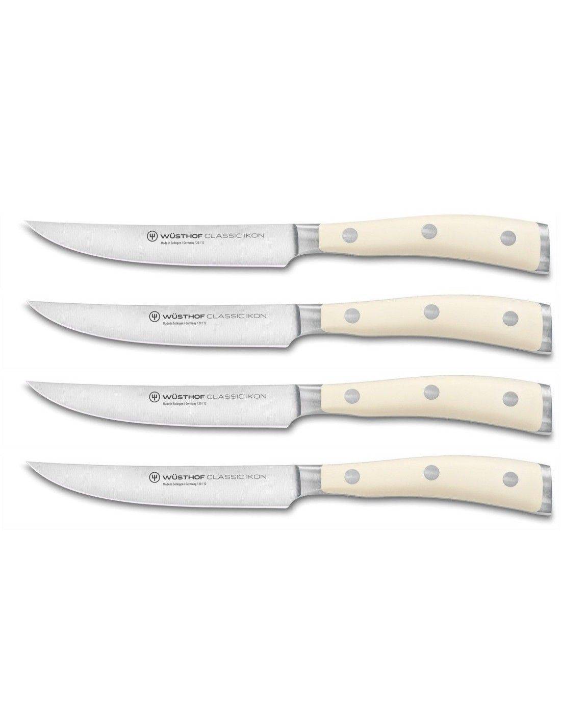 O Wüsthof Classic Ikon Conjunto de 4 Facas de Bife Crème é uma escolha elegante e funcional para servir à mesa com precisão e conforto. Integrado na gama Classic Ikon, este conjunto foi pensado para proporcionar um corte eficaz e limpo em carnes grelhadas, assadas e outras peças servidas à mesa, combinando desempenho com uma apresentação cuidada.