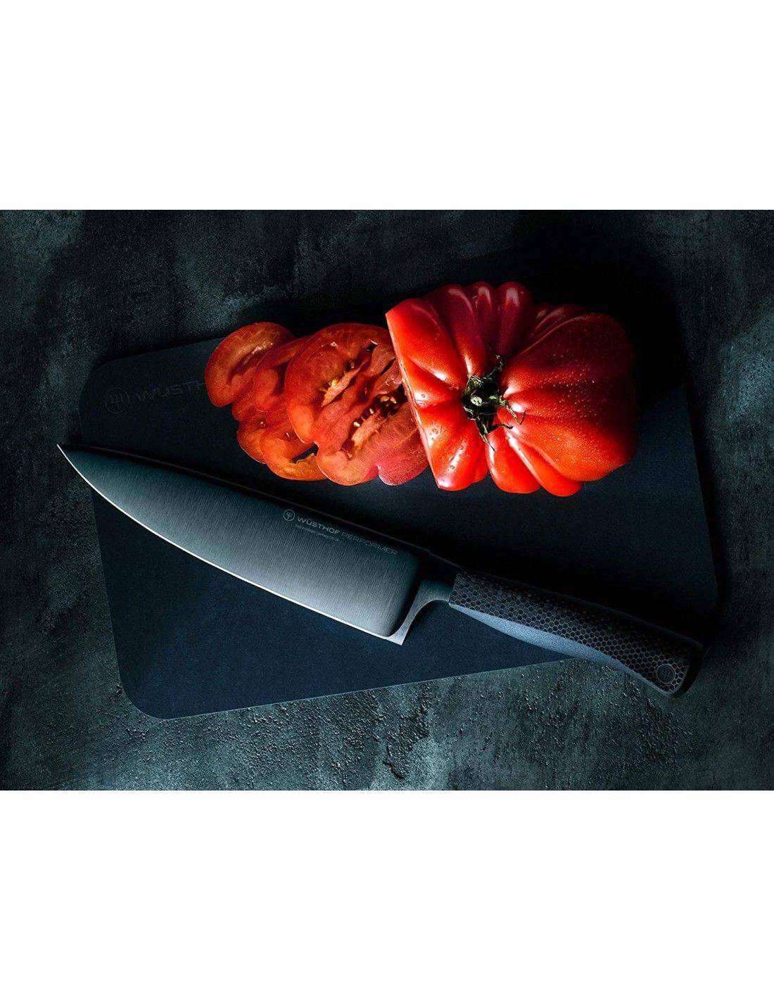 A Wüsthof destaca nesta gama o revestimento Diamond-Like Carbon (DLC) em preto profundo, que torna a lâmina especialmente resistente, durável, resistente ao calor e aos riscos, além de favorecer um corte mais fluido. O cabo com padrão Hexagon-Power-Grip oferece uma aderência antiderrapante e segura, mesmo em utilizações mais exigentes. O full bolster contribui ainda para um equilíbrio ideal entre a lâmina e o cabo.